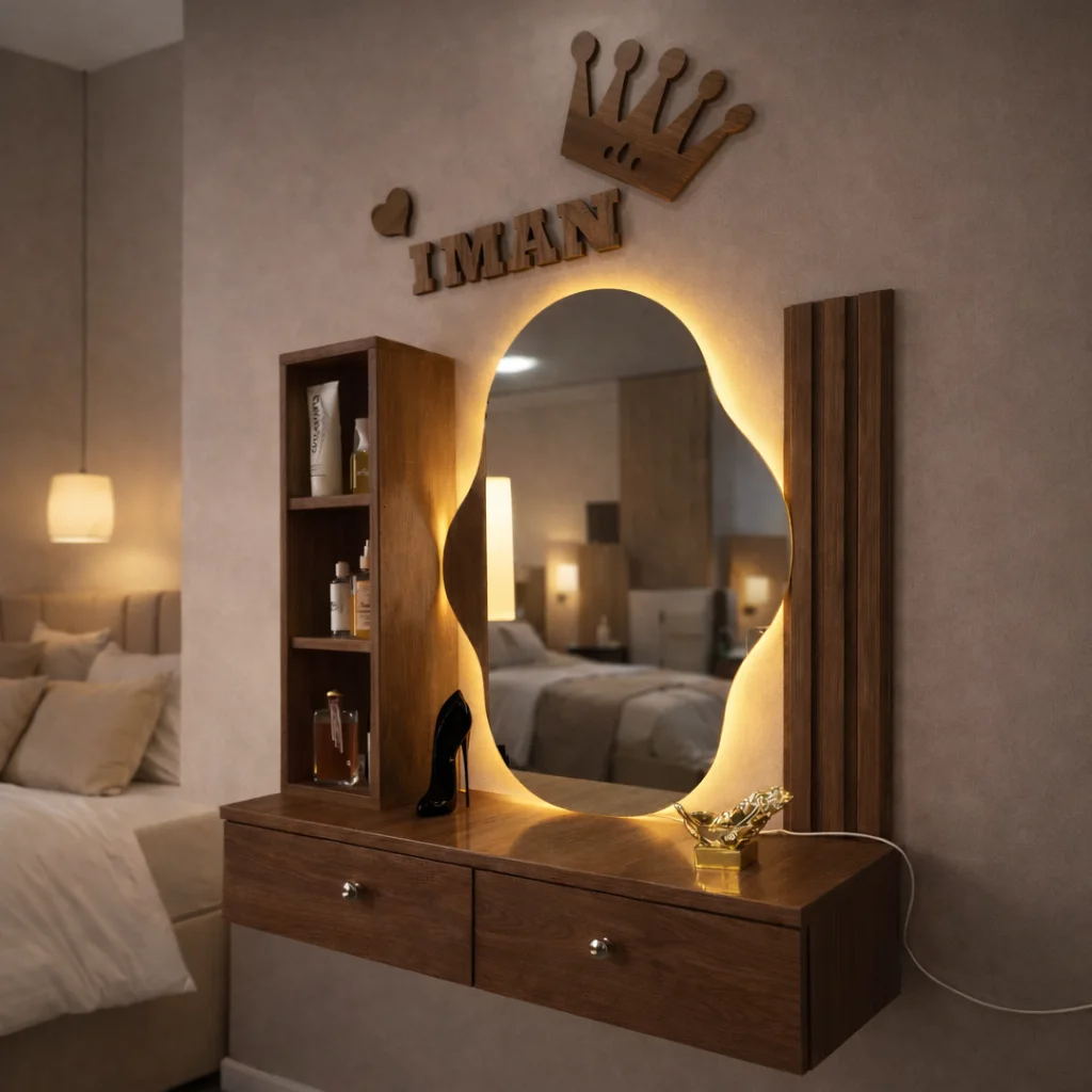 مرآة مكياج عصرية مع رفوف خشبية بتصميم فاخر