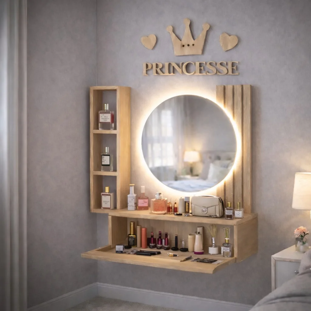 مرآة مكياج عصرية مع رفوف خشبية بتصميم فاخر