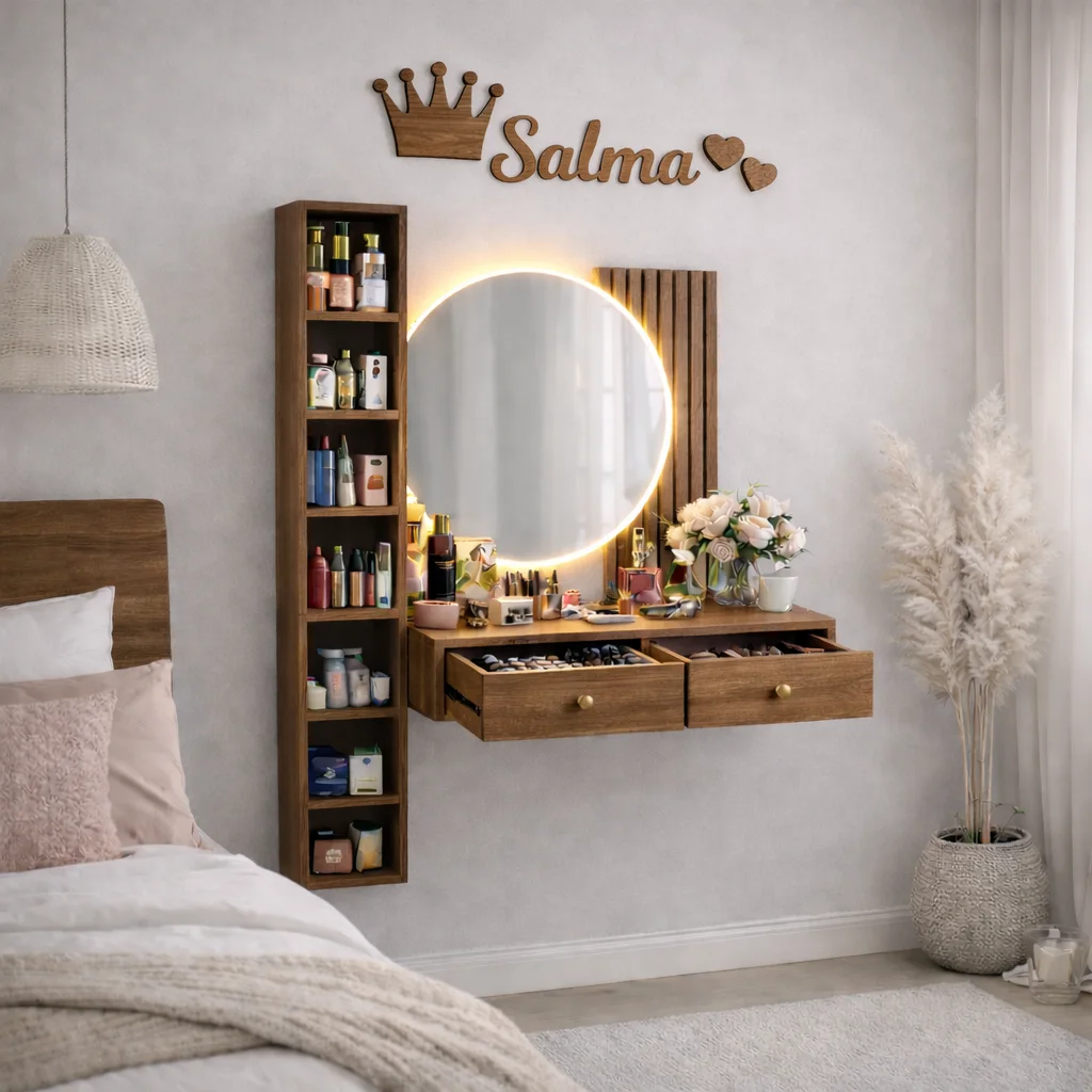 مرآة مكياج عصرية مع رفوف خشبية بتصميم فاخر